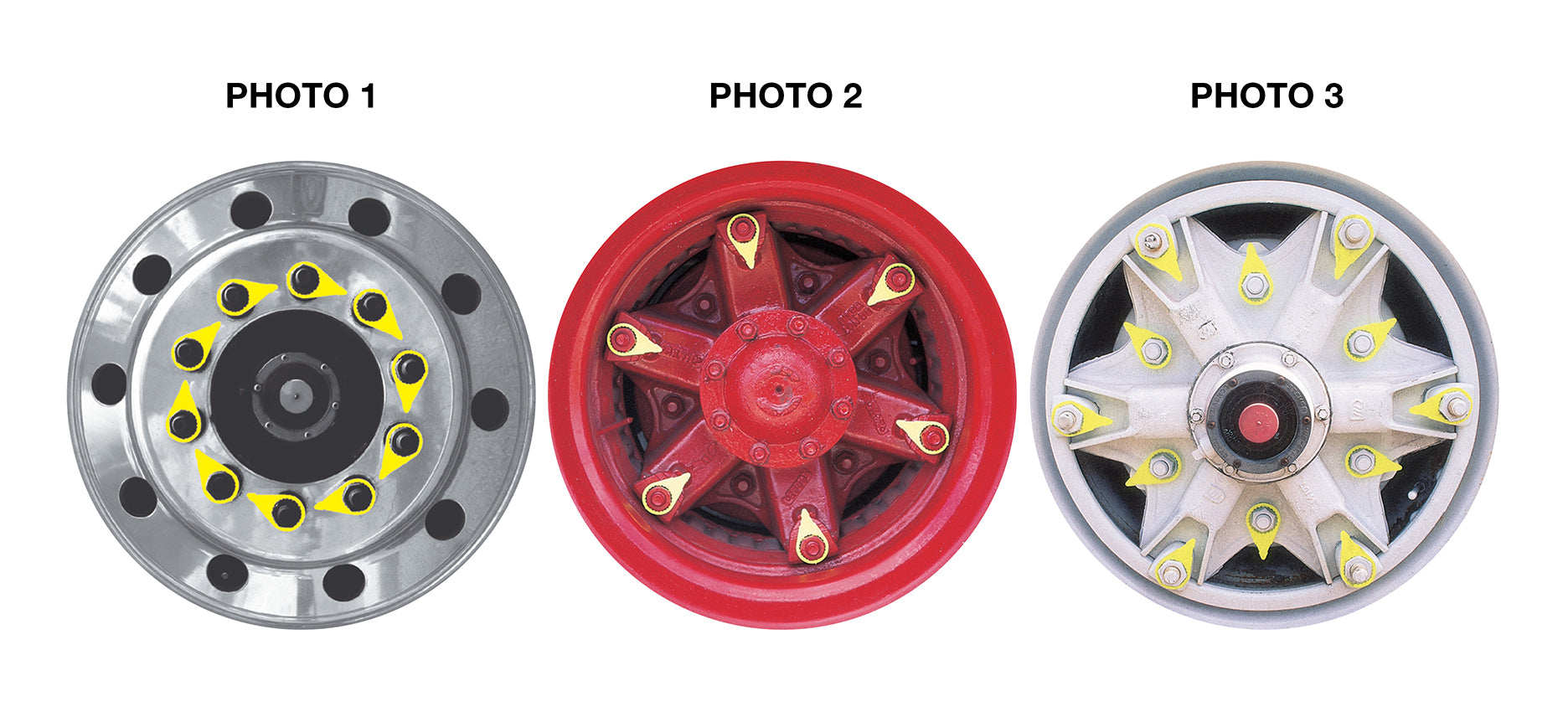 When the wheel nuts are properly torqued to specs, the Wheel-Checks are then placed on the wheel nuts in a uniform pattern. Once a wheel nut has loosened, the Wheel-Check® will become out of sequence.